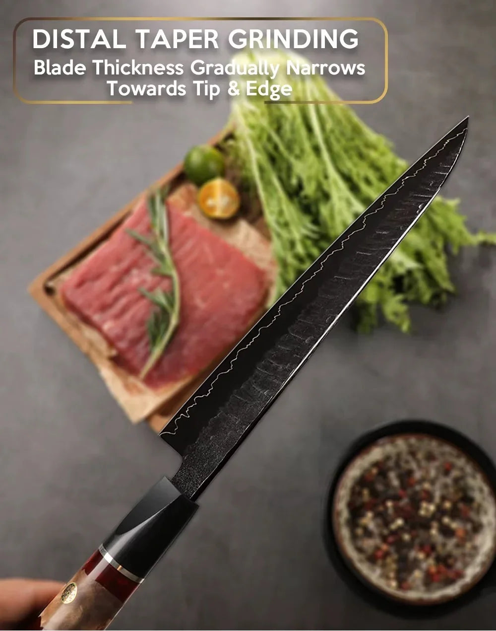 Dieses luxuriöse Einzelmesser aus echtem Sanmai-Kohlenstoffstahl wurde von Meisterhand gefertigt und verbindet höchste Schneidleistung mit außergewöhnlicher Ästhetik – ideal für Profiköche und anspruchsvolle Hobbyköche.